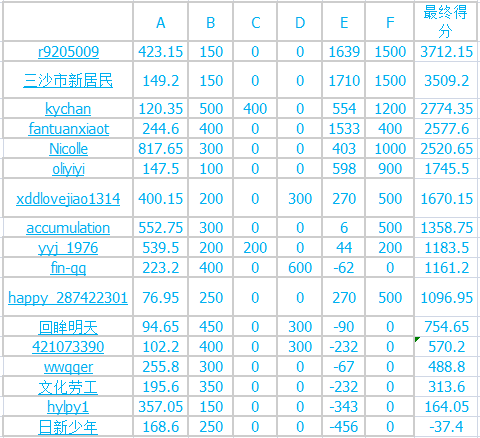 A—工资/100,B—版主议事厅得票数*50,C—被设置精华贴数*200,D—伯乐工程贡献数*300,E—版面访问量月增长率*1000,F—其它事项加分。