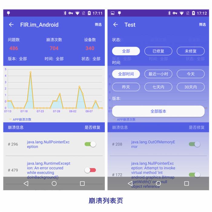 继续查看某个项目的详细崩溃列表,可根据应用崩溃问题的修复状态、崩溃的发生时间、以及版本来筛选崩溃问题。
