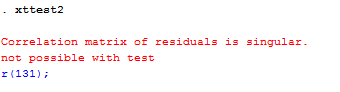 我的数据为unbalanced panel,在xtreg y x, fe后,用xttest2,但是无法显示xttest2的结果,且stata中显示如图所示,不知道为什么会出现这种情况,谢谢大家