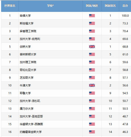 2015年“世界大学学术排名”结果显示:美英大学的优势仍然非常明显,哈佛大学连续十三年蝉联全球第一,斯坦福大学、麻省理工学院、加州大学伯克利、剑桥大学、普林斯顿大学、加州理工学院、哥伦比亚大学、芝加哥大学和牛津大学分别位列第二至第十名。欧洲大陆排名最高的是瑞士苏黎世联邦理工学院,排在世界第二十位,紧随其后的是排在第三十五位的哥本哈根大学。亚洲大学中表现最好的是日本的东京大学和京都大学,名次分别为第二十一名和第二十六名。澳洲大学中排名最高的是墨尔本大学,位列全球第四十四位。