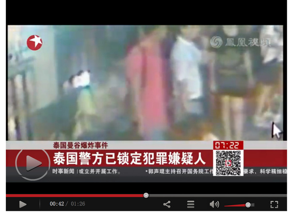 Thai police have issued images of a suspect thought to be behind this week's deadly bombing in Bangkok which has left 20 people dead, including 6 Chinese nationals.The footage, from a closed-circuit camera, shows a man in a yellow shirt leaving a backpack inside the Erawan Hindu shrine.