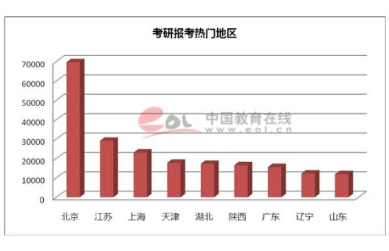 中国教育在线研究生志愿采集系统数据显示,报考人数位列前五的地区为北京市、江苏省、上海市、天津市、湖北省,位列前五的地区考生占报考总人数的50%左右。考生选择这些地区主要考虑到经济因素。