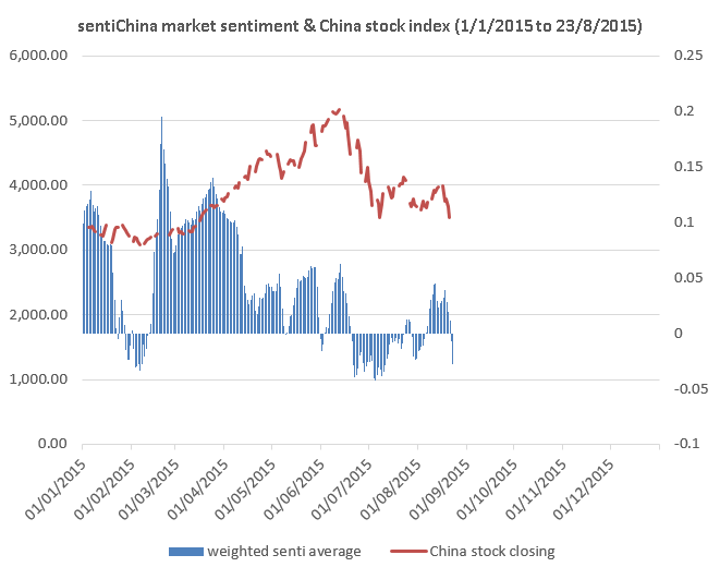 红线是上证指数,蓝线是分析當日在微博上的情绪系数十天加权的平均数值