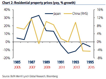 图1显示了自广场协议以来日元实际汇率的升值与2005年以来人民币升值之间的相似性,以及美国国会议员格雷厄姆和舒默所呼吁的30%的升值。图2则显示了,中日经济体之间的另外一个程式化固定的特点是楼市的持续升值和资产泡沫风险。按名义价值计算,日元兑美元汇率自广场协议签订以来的这十年上升了65%。而人民币汇率自2005年以来不再紧钉美元后升值了22%。
