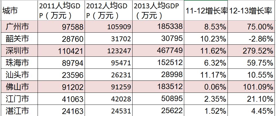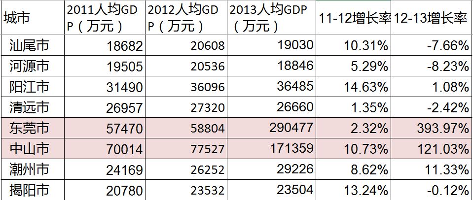 2014年中国城市统计年鉴中(即2013年数据)的人均地区生产总值与往年数据相比跳跃性很大,个别城市2012-2013年人均GDP增长率飙升,像东莞这种奇葩竟然翻了好几番。[size=13.63636302948px]起初我以为是数据来源问题,统一经CNKI下载发现数据确实如此;后来我以为是数据统计口径问题,对比了近几年的指标解释发现没有变化。