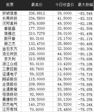从图中可以看出,6月以来跌幅最大的20只个股,平均跌幅超过80%,且集中在互联网+的企业。但是值得注意的是,还有大批蓝筹股和概念股仍然处于高位。
