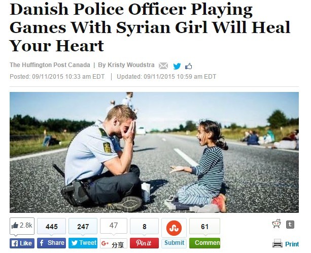 丹麦帅警跟难民女童玩游戏,感动不少人。(图/翻摄自huffingtonpost)