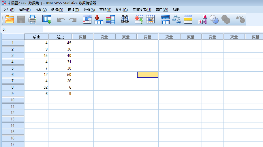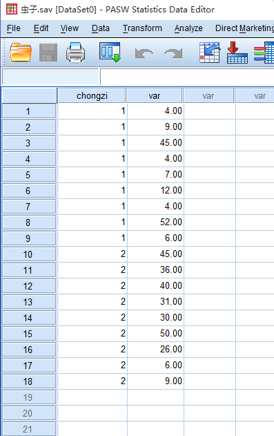 我就是用这两组数据试试独立样本分析,没有实际意义的,但就是不能得到结果,提示“未生成独立样本表”“无法计算T值,因为至少有一个组为空”。出现这样的提示是哪些原因产生的呢?初学者,烦请各位指点,在此表示万分感谢!!