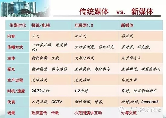 我们来比较一下,传统媒体和新媒体的差别在哪里?这里面我们要看到新媒体的内容是非正式的,大家来看为什么当年新浪极力推博客,博客始终火不了?微博和博客的差别在哪里呢?其实就是一个小的变化,说我们原来是要求像小学生写日记一样,写长篇大论,现在140字就可以了,这就导致了内容的非正式。还有这里是更多的多对多点,一个社交型的。尤其想强调的是现在在新媒体的环境下,它是一个对等交流,比如说我们CCTV和人民日报,它更多的是政治宣传,这就相当于它是一个在农村的大喇叭广播,我在这里广播,我不需要大家反馈,大家听着就好了。为什么现在一些政府,包括一些大的媒体在社交网络上已经成为了一个弱势群体,反而一些草根大V做的非常好,原因就在于他们没有把握他的场景变化。现在新媒体环境下更像是不站在台上讲,而是搬着椅子坐在你旁边讲。