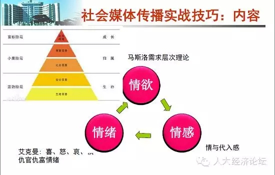 我们再来看看内容的,这里有一些技巧,这有一个“三情”的理论。尤其现在比较火的传播,基本利用了人的基本需求,尤其是生理需求和安全需求。大家看一看现在很多的新闻网站,都在利用打擦边球,会经常放一个看上去,我刚刚还看了一条,让我们来看看河南的情色大片,点进去一看是它们很好的美景。安全需求,就是像你不转就不是中国人。还有就是在情绪方面的,具体在中国的表现就是仇官、仇富情绪。我经常举例子讲,如果我们想要攻击一个人,我们只需要说几句话就可以,说这个人开着玛莎拉蒂来上学,他的背景很深,具体有多深我不知道。这有两个就够了,这个过程当中,仇官仇富情绪一引发,这过程没有人追踪他是谁,所有的情绪都过来了。