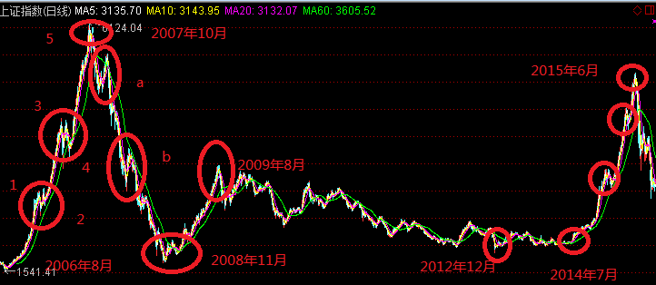 一、股市大体符合艾略特波浪理论以上证综指为参考,在2006~2008三年间,股市从2006年8月份1541点上涨到2007年10月份6124点,这个区间从形态上可以看出是完全符合艾略特波浪理论的,主波浪3个,调整波浪两个。从最高点跌到2008年10月的1664点,形态大体上符合艾略特波浪理论。