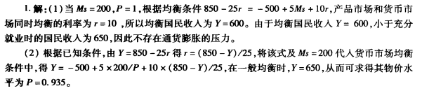 则P=0.95238……=0.95(因为第一问求出的是实际经济的产出水平,所以实际的R=10,第二问宏观经济研究的其中 一点是充分就业水平,所以直接Y=650代入)