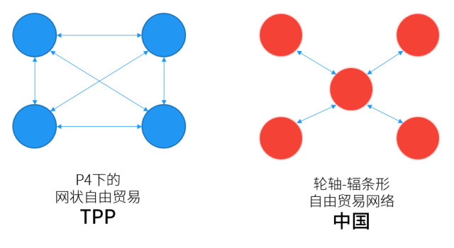 对中国而言,不加入TPP,但可以和这些国家分别签署类似的协议啊! 比如中国可以和澳大利亚签署,可以和秘鲁签署,当然因为这样的方案,仅限于中国和这两个国家,澳大利亚和秘鲁之间不会因此出现类似的关系,所以是一个类似自行车轮轴的结构,中国是当中的轴,然后周边有一堆的签署国。这个结构,就被称为轮轴-辐条(Hub and Spokes)形FTA网络。