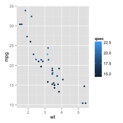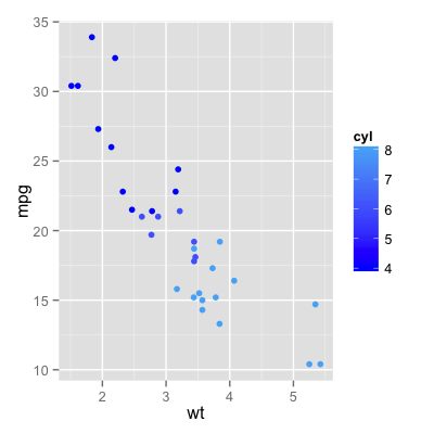 p + geom_point(aes(colour = cyl)) + scale_colour_gradient(low ="blue")