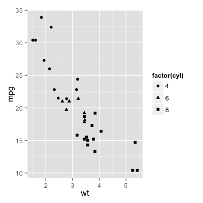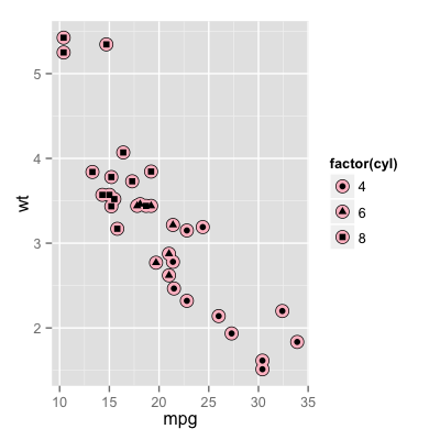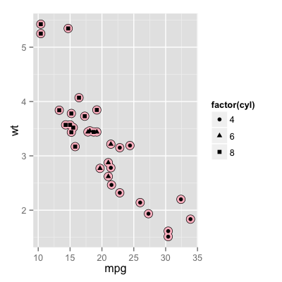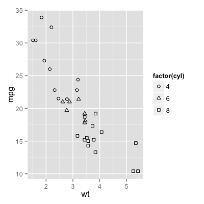 p + geom_point(aes(shape = factor(cyl))) + scale_shape(solid = FALSE)