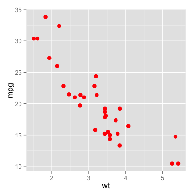 qplot(wt, mpg, data = mtcars, colour = I("red"), size = I(3))