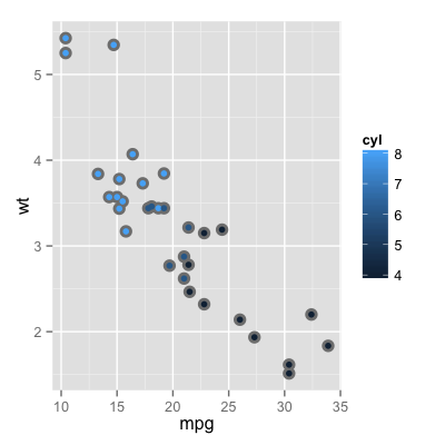 p + geom_point(colour="grey50", size = 4) +geom_point(aes(colour = cyl))