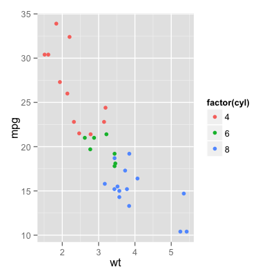 qplot(wt, mpg, data = mtcars, colour = factor(cyl))