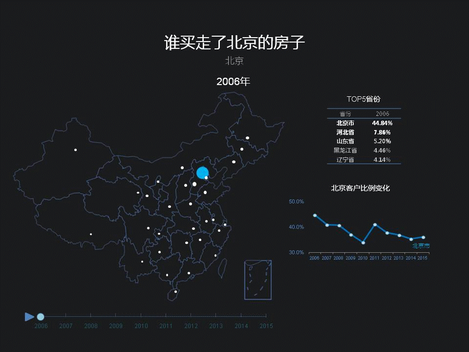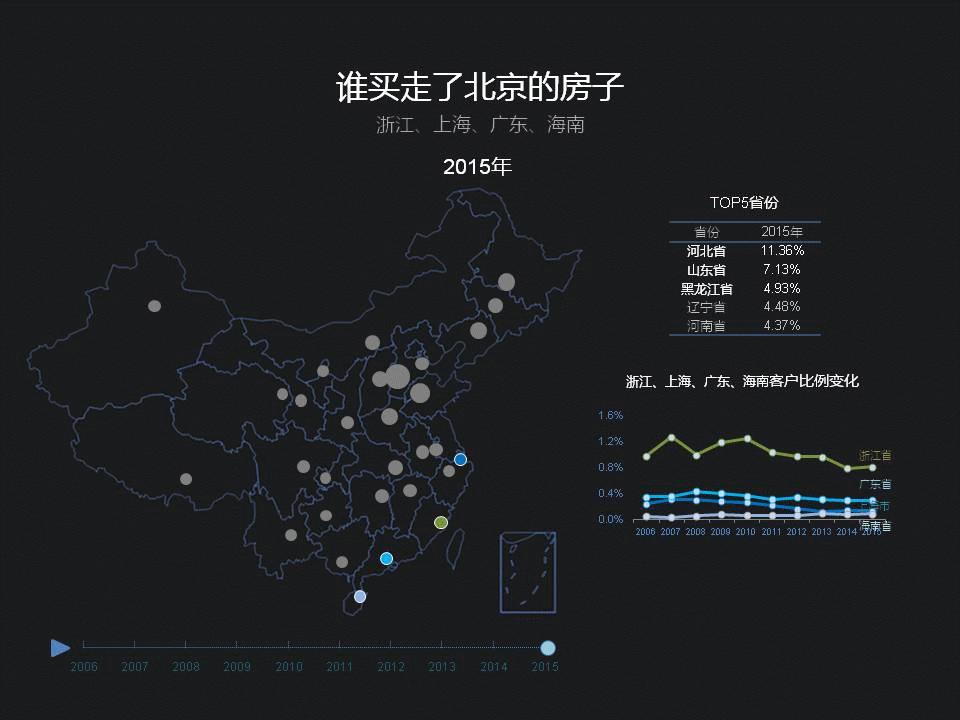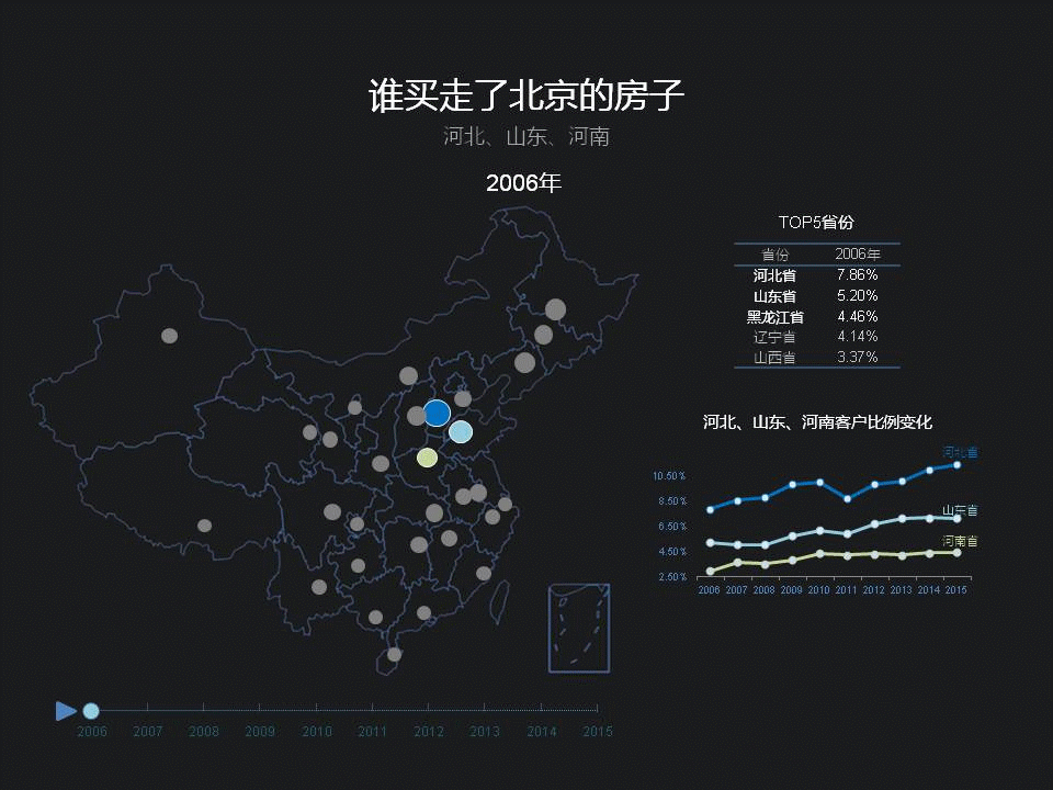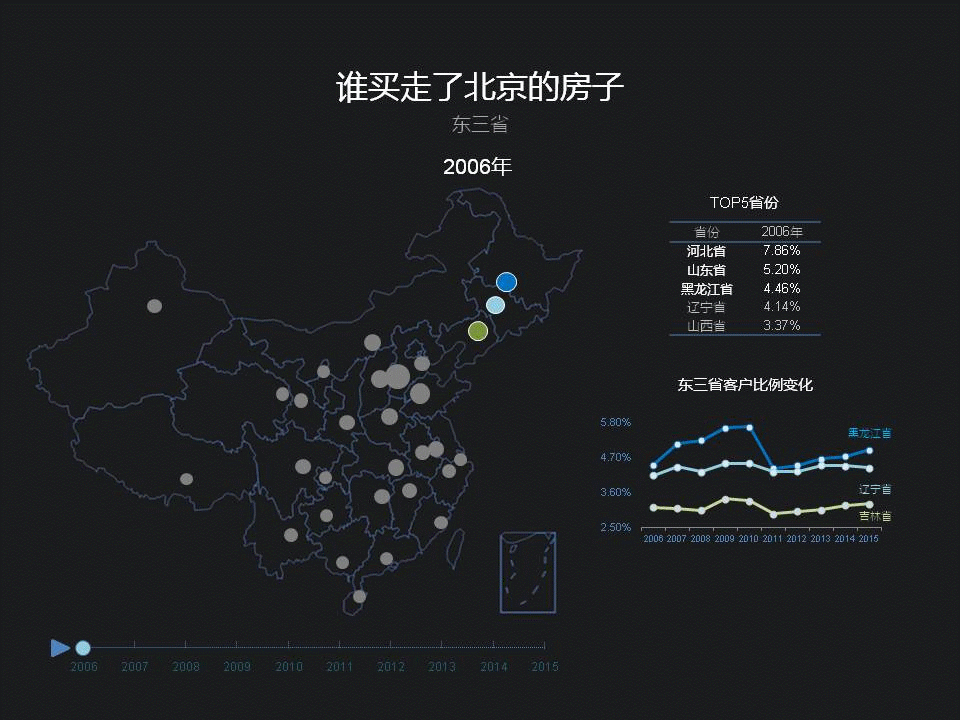 东三省在京客户的比例,从11年开始出现下降,近两年有些回升。特别是黑龙江,北京2011年开始执行严格的限购,跟这个有关系吗?也许,但从经济角度看,东三省从06年到10年这几年,在全国经济比重当中是呈下滑趋势的,这几年才逐渐回升,但不是直线上升,有一些反复,整体看,东三省经济的发展跟在京购房人数的比例,是可以相互印证的。看来,东三省的ZF官员,可以借鉴一下北京链家的大数据啊,大宗不动产的交易,背后实际上,体现的是人才和财富的变动。