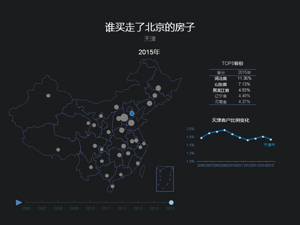 北京二手房购房客户比例里,天津占比持续下降,06年占比1.73%左右,15年下降到1.68%。天津对于留住本市购房者,看来有一套。天津这几年的经济发展,速度也的确够快,06年GDP 0.4338万亿,在省市里全国排名21名,14年做到了1.5万亿,已经跃升17名。天津越来越有吸引力啊。