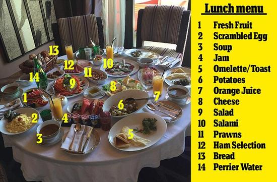从C罗贴出的图片可以看到,庆功宴每桌至少有14种食物,包括新鲜水果、炒鸡蛋、汤水、果酱、煎蛋卷、吐司,土豆、橙汁、奶酪、沙拉、意大利腊肠、大虾、火腿切片、面包和矿泉水。媒体表示,从食物组成来看,这是相当健康,有营养的菜单,可以说几乎没有垃圾食品。