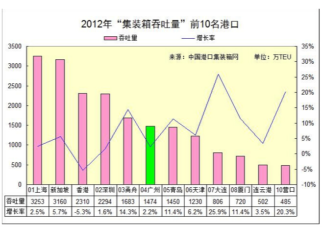 我国计划到 2020 年全面建成小康社会,人均国民生产总值比 2000 年翻两番。这就意味着我国大陆经济仍将以高位、高速和持续的态势增长。在经过2008年以及2010年上海世博会对集装箱的大量需求,直至到2012年我国集装箱的吞吐量还是呈上升趋势的,但到2010年后集装箱的吞吐量的上升趋势有减慢的现象,中国港口研究中心根据2012的数据绘出了集装箱吞吐量的增长率图。
