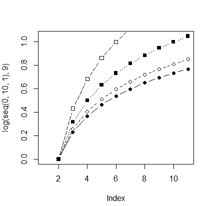 points(log(seq(0,10,1),5),pch=0,lty=5,type="b")