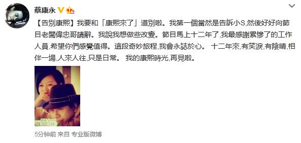 蔡康永说,“我要和《康熙来了》道别啦。我第一个当然是告诉小S,然后好好向节目老板伟忠哥(王伟忠)请辞。我说我想做些改变。节目马上十二年了,我最感谢累惨了的工作人员,希望你们感觉值得。这段奇妙旅程,我会永志于心。十二年来,有笑泪,有阴晴,相伴一场,人来人往,只是日常。我的康熙时光,再见啦”。蔡康永还晒出了一张与老搭档小S的合影。