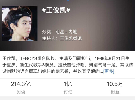 TFBOYS组合队长王俊凯人气超高,今年陆续打破多项互联网社交平台记录:今年6月他一条微博转发4277万,获得吉尼斯世界纪录;今年8月,他成为首个95后微博粉丝破千万的得主;2015年10月20日晚18时#王俊凯#话题更成为微博历史上首个讨论破亿的话题。