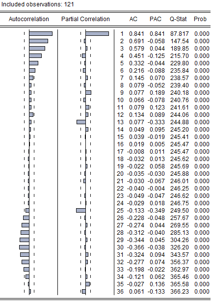 YeahQQ 发表于 2015-10-22 07:37 如下图所示: 样本量121比较大,所以检验时默认滞后期选择为36,但后期(滞后25期之后)实在有点惨不忍睹 ...