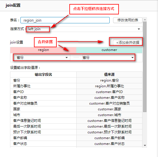 点击确定使用,进入join配置界面,在连接方式下拉框中可以选择不同的连接方式,这里使用默认的left join,合并依据为省份字段,如下图: