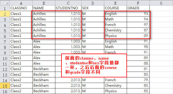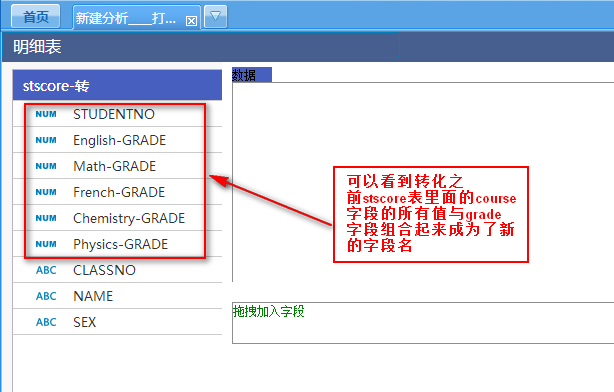字段添加完成之后,可以看到如下图明细表,每个学生只有一条记录,所有学科都转化为字段名,与上图效果一致。
