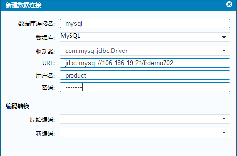 ETL转换表需要基于一个原始表,我们以上图的stscore表为例,该数据表存在于另外一个数据库中,不存在于BIdemo业务包中,故,首先我们需要新建一个数据连接,用来获取该张源数据表,点击数据配置>数据连接管理,新建一个数据连接mysql,配置如下图: