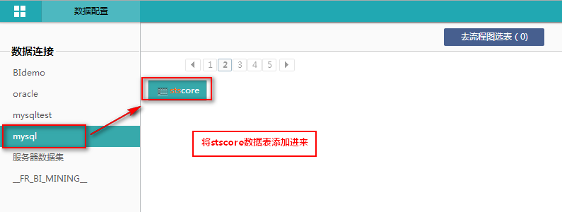 点击业务包管理,选中BIdemo业务包,在业务包管理界面点击+ETL表按钮,页面跳转到ETL处理界面,点击右上角的添加表按钮,在数据表选择页面中选中mysql数据连接,选中该数据连接下的stscore表,如下图: