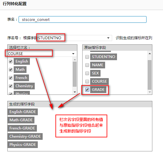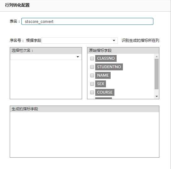 根据字段识别生成的指标所在列:是指数据表中根据需要转化的字段值重复的字段,如上示例,name和studentno就根据需要被转化字段course的值重复出现,那么该下拉框中的字段可以选择name或者studentno;