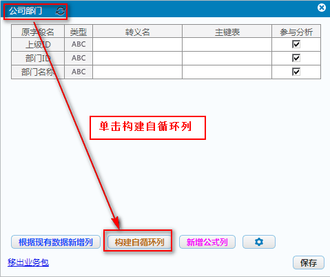 点击公司部门,进入公司部门配置界面,单击构建自循环列,可以看到构建自循环列有两种方式:一个是根据一列数据分层,一个是根据两列数据分层,如下图: