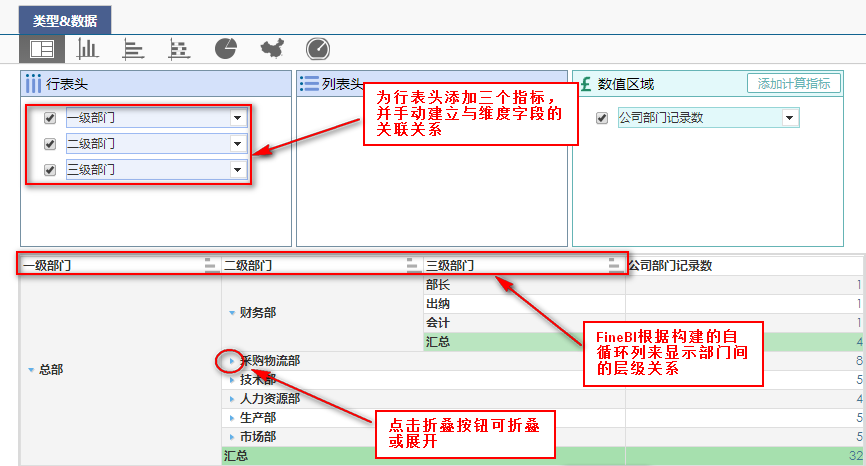 类似于一级部门名称的设置方式,再为行表头添加2个指标维度,指标字段均为部门名称,并设置数据标签,分别关联二级部门名称和三级部门名称,切修改指标名称为二级部门和三级部门,即可完成设置。