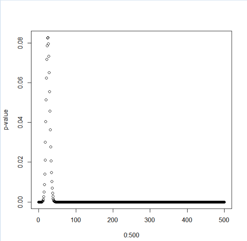 这是0到500之间每个点下的p值,我们把它拉大到0-50之间每个点下的P值