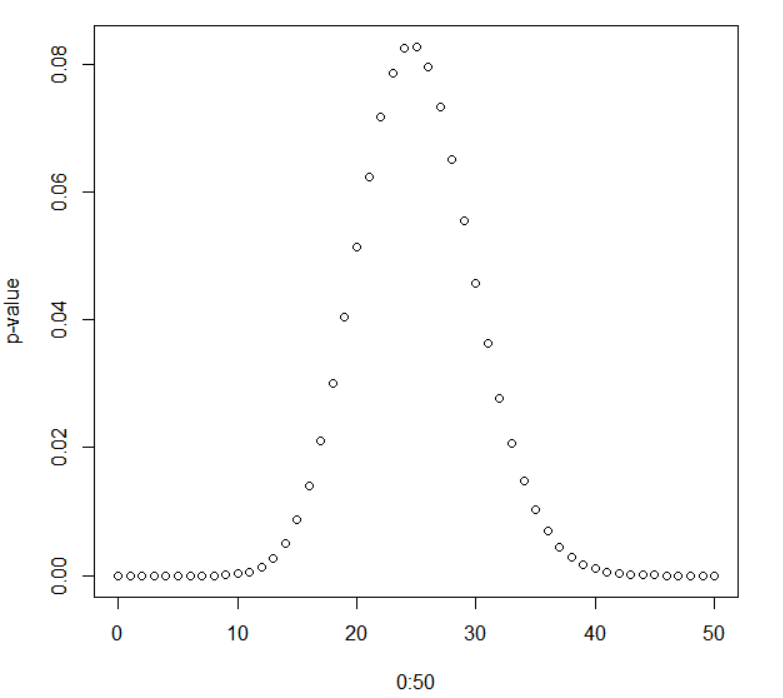 很明显,超几何分布的离散值是一个类似正态分布的(这里只是说图形部分相似,正态分布没有详细了解不敢妄言)分布模型。P值是先上升,到达峰值后下降的一个趋势。经计算当当x=26时p-value最大为0.08169。