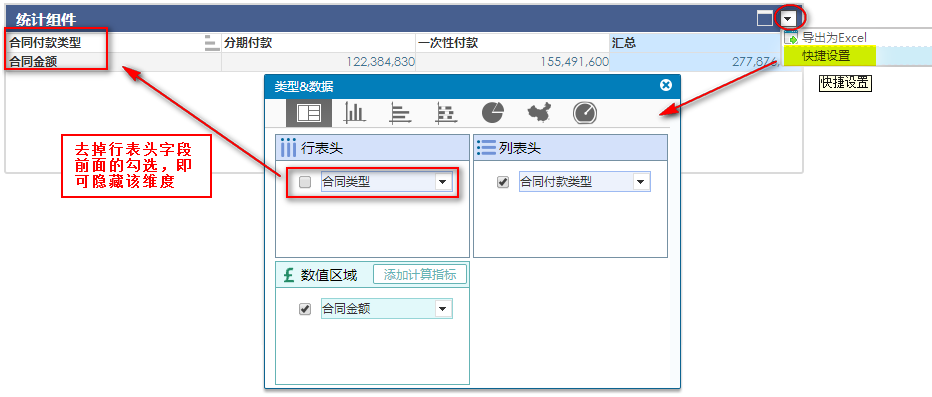点击FineBI商务智能平台右上角的下拉按钮,快捷设置,弹出类型&数据设置对话框,去掉行表头字段前面的勾选,将纵向表头隐藏起来,如下图: