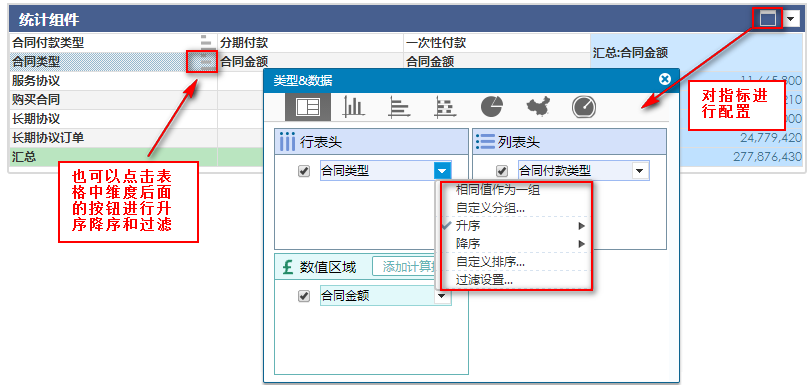 商务智能FineBI除了可以对维度和指标设置是否可见之外,还可以对维度指标和数值指标进行配置,包括过滤和排序,如下图,点击合同金额后面的下拉按钮,可以看到所有选项: