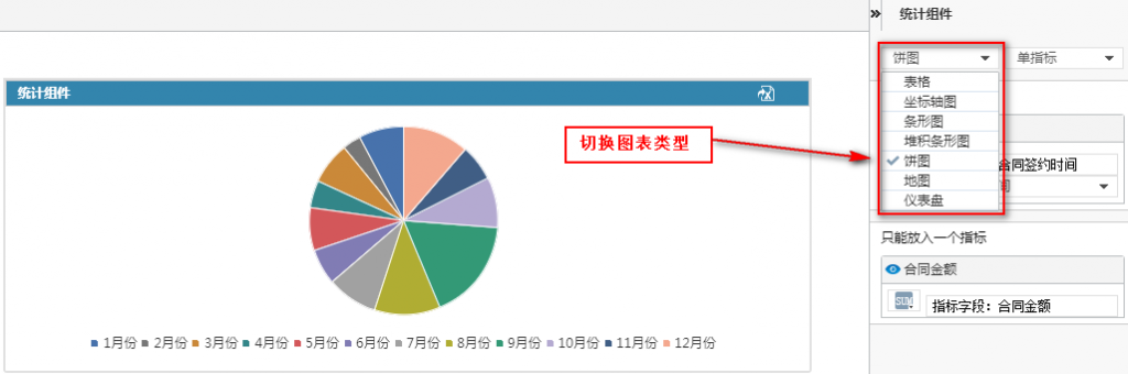 点击组件名称下面的下拉框即可切换图表类型,如下图: