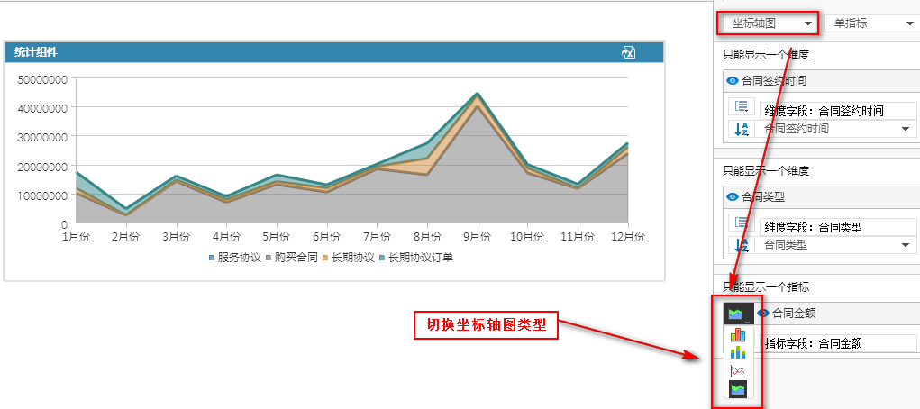 在图表分析示例中介绍了坐标轴图包含了四种图表类型,那么又该如何在坐标轴图内切换图表类型呢?如下图,点击值区域指标前面的商务智能切换坐标轴图类型按钮,即可切换坐标轴图类型: