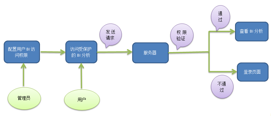 现今,为了保密和业务的需要,各种应用系统都有权限方面的控制,FineBI商务智能也不例外,其具体实现过程如下图: