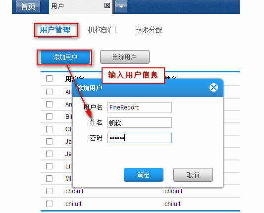 用户管理用来添加、编辑、删除用户,用管理员账号登录FineBI商务智能平台,点击管理系统>用户,如下图我们添加几个用户,