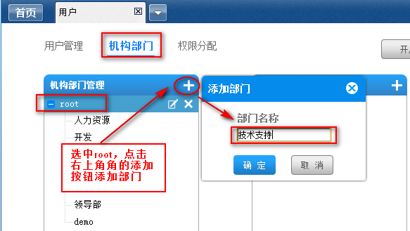 点击机构部门,在左侧的机构部门管理中,选择root,单击右上角的添加按钮,添加一个一级部门,如下图: