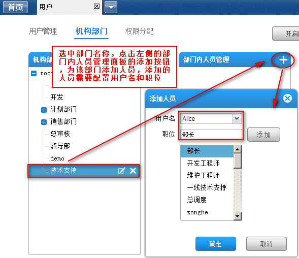 选择“技术支持”部,添加属于该部门的人员,并设置好对应的职务,如下图,为技术支持部门添加一位员工,Alice,其职位为部长,选择好之后,点击确定即可: