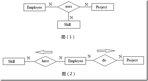 三元关系联系三个实体。当二元关系无法准确描述关联的语义时,就需要使用三元关系。我们来看下面这个例子,下图(1)能反映出一个Employee在某个Project中使用了什么Skill。下图(2)只能看出Employee有什么Skill,参与了哪些Project,但无法知道在某个Project中使用的特定Skill。