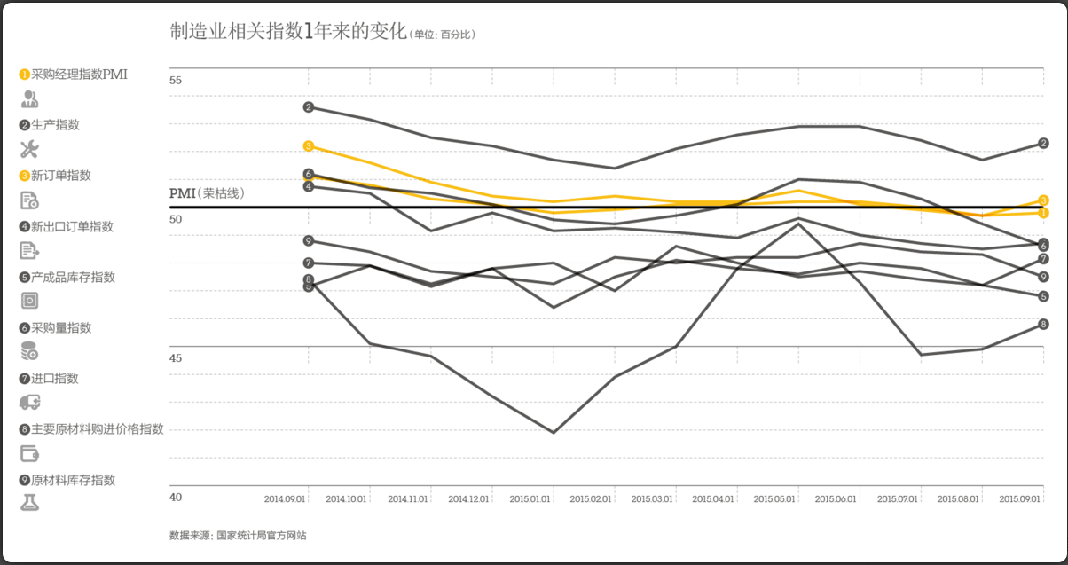 根据国家统计局的数据,中国制造业采购经理指数(PMI)在过去一年时间里,一直挣扎在50%的荣枯线上,其中有4个月低于50%。