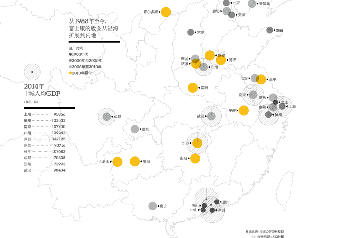 从1988年至今, 富士康的版图从沿海 扩展到内地
